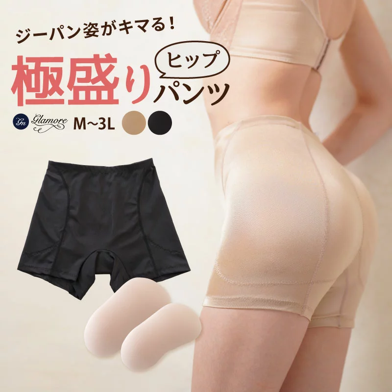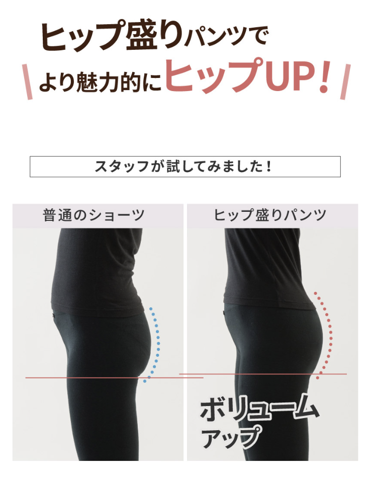 glamore ヒップ極盛りパンツ は「お尻のボリュームがあまりない」「プリリとしたヒップにあこがれる」という人におすすめです。ヒップパッドがついているので、はくだけでお尻のボリュームがアップします! そして、ヒップアップすると同時に脚が長く、美脚にみえる効果も同時に得られ一挙両得です。